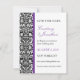 Um padrão de papel de parede damasco preto e branco juntamente com acentos roxos reais servem para destacar este convite. Facilmente personalizado com seu(s) nome(s), data do evento e informações. A parte traseira é intencionalmente deixada em branco. Disponível em cores alternativas com favores, cartões postais e convites correspondentes