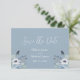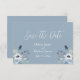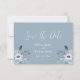 Cartão “Salve a data” floral azul claro e branco. Os nomes são feitos em elegante escrita cursiva branca. Perfeito para aquele casamento de primavera, verão, outono ou inverno.