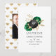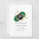 Convite de casamento floral elegante em verde, preto e dourado foil falso com verso em padrão de diamante personalizável para os detalhes do seu evento.