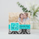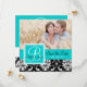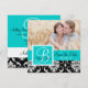 Cartões de aviso de data de casamento com foto em padrão damasco nas cores azul-turquesa, preto e branco, monogramados com seu monograma, inicial e nomes, cartão simples com sua foto de noivado na frente e seu texto no verso. Modelo totalmente personalizável. Elke Clarke© Uma maneira linda de anunciar aos seus convidados o dia do seu casamento com este design moderno com elementos tradicionais, como o padrão damasco vintage. Para outras cores de damasco, por favor, entre em contato com luxuryweddinginvitations@gmail.com