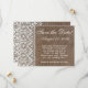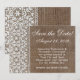 Anúncio de salve o dia simples de burel e renda em cartões planos. O tema natural é ótimo para um casamento rústico, ao ar livre ou no campo. Imagem texturizada e áspera do burel contrasta com a renda delicada e elegante. Copyright © www.CustomInvitesOnline.com
