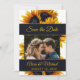 Belo e fácil de personalizar casamento fotográfico, salve o cartão de encontro com girassóis amarelados vibrantes e marinhos pintados à mão e elegantes listras azuis escuras e elegantes com roteiro de caligrafia de tendências. ++++++++++ Adequado para o Verão e outono no jardim de outono/casamentos modernos no rusticismo no quintal exterior.