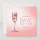 Declaração de casamento Save the Date personalizável com um design romântico e fofo com um copo de champanhe rosa contendo dois corações vermelhos de doce.