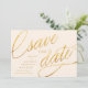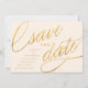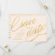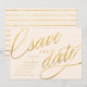 Esses save the dates modernos e únicos apresentam uma fonte fancy em um efeito de folha de ouro falso em um fundo de cor de champanhe doce, com os detalhes do anúncio do casamento em branco. O verso apresenta um padrão de faixa dourada trendy. Altere a cor do fundo usando a ferramenta "Personalizar"!