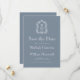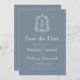 Este elegante casamento inspirado na vintage Save the Date design apresenta um par de iniciais de monograma branco em letra serif aberta acima e abaixo de uma linha divisória e rodeado por uma crista de acanthus de uma linha em um fundo azul empoeirado. A parte traseira da placa é azul empoeirado sólido.