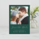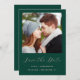 Este simples e minimalista Cartão Salvar a Data contém uma foto quadrada acima das palavras "Salvar a Data" em um elegante roteiro cor-de-rosa, seguido pelos nomes do casal, data do casamento e cidade em sans serif em um fundo verde esmeralda. Adicione uma mensagem mais detalhada com informações adicionais sobre o contrário.