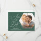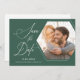 Esta foto moderna salva o anúncio da data apresenta um quadro de fotos hexágono em um fundo verde empoeirado. O design é acentuado com um roteiro elegante e texto personalizado para a data do casamento, nomes e localização. Texto adicional, no verso, permite adicionar mais detalhes do casamento.