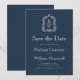 Este elegante casamento inspirado na vintage Save the Date design apresenta um par de iniciais brancas monográficas em letra serif aberta acima e abaixo de uma linha divisória e rodeada por uma crista de acanthus de uma linha em um fundo azul marinho. A parte traseira da placa é azul marinho estável.
