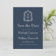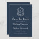 Este elegante casamento inspirado na vintage Save the Date design apresenta um par de iniciais de monograma branco em letra serif aberta acima e abaixo de uma linha divisória e rodeado por uma crista botânica de arte de linha sobre um fundo azul marinho. A parte traseira da placa é azul marinho estável.
