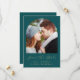 Este simples e minimalista Cartão Salvar a Data apresenta um boho de fotos acima das palavras "Salvar a Data" em um elegante guião de manuscrito dourado, seguido pelos nomes do casal, data do casamento e cidade em sans serif em um fundo azul teal. Adicione uma mensagem mais detalhada com informações adicionais no verso, juntamente com um código QR que envia convidados para o seu site de casamento.