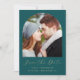 Este simples e minimalista Cartão Salvar a Data apresenta um boho de fotos acima das palavras "Salvar a Data" em um elegante guião de manuscrito dourado, seguido pelos nomes do casal, data do casamento e cidade em sans serif em um fundo azul teal. Adicione uma mensagem mais detalhada com informações adicionais sobre o contrário.