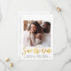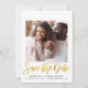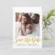 Casamento moderno mínimo, salve o cartão de anúncio de data com duas fotos (1 na frente, 1 na parte traseira), "Salvar a Data" escrito em um roteiro falso em ouro na moda e a data do casamento, local e informações do site em uma simples tipografia.