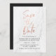 Casamento moderno de na moda guarde as datas que contêm uma fonte falsa de roteiro de folha de rosa dourada, fundo de mármore branco e espaços reservados para suas informações personalizadas de casamento. A parte de trás da data de salvamento pode ser alterada para uma cor de sua preferência com a ferramenta Personalizar.