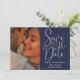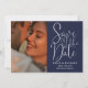 Este convite para salvar a data do casamento com o script elegante azul marinho pode ser personalizado com suas duas fotos especiais, informações sobre o dia do casamento e o código QR do site do casamento. Projetado por Thisnotme©