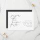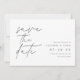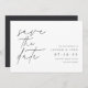 Casamento simples e elegante salve as datas para os casais modernos minimalistas que contêm "salve a data" em letras manuscritas alinhadas à esquerda. Seus detalhes de casamento aparecem em letras clássicas à direita. Use o verso para compartilhar informações adicionais com seus convidados.