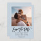 Anúncio Minimalista Moderno de Salvar a Data com tipografia manuscrita de pincel moderno em azul empoeirado com sua foto pessoal ao lado de seus nomes e data do casamento.