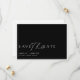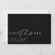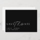 Cartões salve a data elegantes e modernos, perfeitos para anunciar sua nova data de casamento. Fundo preto com um quadro branco elegante. "Salve a data" é lindamente desenhado em branco. Personalize com seus nomes, data e local. A cor de fundo, o quadro e o texto podem ser alterados para corresponder às cores do casamento.