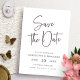 Script Simples Salve a Data. Este moderno cartão de salvamento de data e gravações minimalistas é perfeito para casais que querem fazer uma declaração ao estilo contemporâneo. A elegante caligrafia combinada com a paleta de cores preto e branco criará um eterno que não se esquecerá. Faça uma declaração ousada com este design único e na moda!