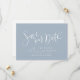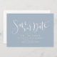 Mão escrita para salvar o script de data em um fundo azul empoeirado editável a cores, elegante e na moda, cartões salve a data simples e personalizados modernos excelentes. Veja todas as peças correspondentes na coleção.