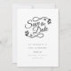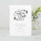Este simples cartão de salvar a data em preto e branco apresenta um belo texto de salvar a data com um motivo de folha, definido acima dos seus detalhes em um texto moderno e elegante.