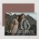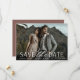 Um cartão de data moderno, projetado para acomodar sua foto favorita de noivado de sangramento horizontal ou orientada a paisagem. "Salve a data" aparece perto do fundo da sua foto em caracteres brancos e escrita, com seus nomes, data do casamento e local do casamento embaixo. Cartões postais inversos para mostrar detalhes adicionais de data.