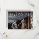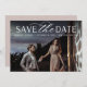 Um cartão de data moderno, projetado para acomodar sua foto favorita de noivado de sangramento horizontal ou orientada a paisagem. "Salve a data" aparece no topo da sua foto em caracteres brancos e em letras de guião, com seus nomes, data do casamento e local do casamento embaixo. Cartões invertidos para mostrar detalhes adicionais da data.