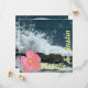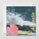 Praia tropical salvará a data com ondas esparramando contra a costa, coral rosa hibiscus e texto ousado divertido. Maneira perfeita de anunciar um próximo casamento de destino perto do mar.