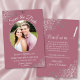 Estas belas cartas são uma forma excelente de deixar seus amigos e família saberem salvar a data do seu próximo casamento. Eles apresentam um elegante rosa poeirento ou um design cor-de-rosa-mauve com sua foto em um quadro em forma oval cercado por caracóis e espirais de cinza prateada e letras de roteiro de rico com seus nomes, data de casamento e local. O verso tem um gráfico bonito de "lápis nós in" com espaço para uma nota que pode incluir um site onde seus convidados podem obter mais informações.