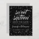 Design de "Doce 16 ( Dezesseis )" elegante e moderno com o Motif de Disparador de Luz de Festa de aniversário de Prata e Cinzas e pontos de Confetti de brilho preto, e nome personalizado e texto de detalhes. Fácil de usar e fácil de personalizar. Peça a sua hoje!