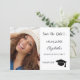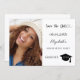 On front: Add your own vertical size photo of the graduate. A chic white background, black text. Templates for a name and date. The name and the text: Save the Date are written with a modern hand lettered style script. With a cap, tassel topper.