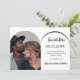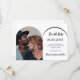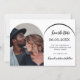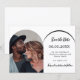 Uma foto Salve o cartão de data do seu casamento. Na frente: adicione seu próprio dentro de foto de tamanho vertical ao quadro de fotos de arco. Um fundo branco chic, texto preto. Modelos para nomes e data. O nome e o texto: Salvar a Data são escritos com um script de estilo moderno com letra manual. Voltar: você pode adicionar mais texto se quiser. Vá para a ferramenta design e adicione a camada traseira.