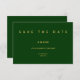 Um casamento Salve a Data que é feita em esmeralda verde com tipografia dourada (não-folha) com informações suficientes para ganhar o dia. Este item faz parte de uma coleção de casamento que inclui sua escolha de convite, um cartão RSVP, Salvar a Data e muito mais. Coloque suas informações neste cartão, adicione-as ao seu carrinho, e tenha um casamento maravilhoso. Simples casamento Emerald Green Minimalista Salve a Design de Feriado de Data | ©Melissa Patton - Designer