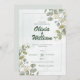 Convite de casamento com um design verde elegante moderno. No espírito da beleza eterno da natureza, nosso convite é adorado com o toque fresco e fragrante das folhas de eucalipto, simbolizando a força e a resiliência que o amor traz à vida.