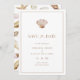 Único & na moda, este casamento de praia moderno, exceto a data do anúncio, contém lindos conchas, corais e estrelas pintadas à mão em neutrais de tons de terra. O texto é bronzeado e o fundo é branco. O verso inclui um padrão de células brancas. Localize itens correspondentes na Coleção de Casamento de Praia de Watercolor Seashell.