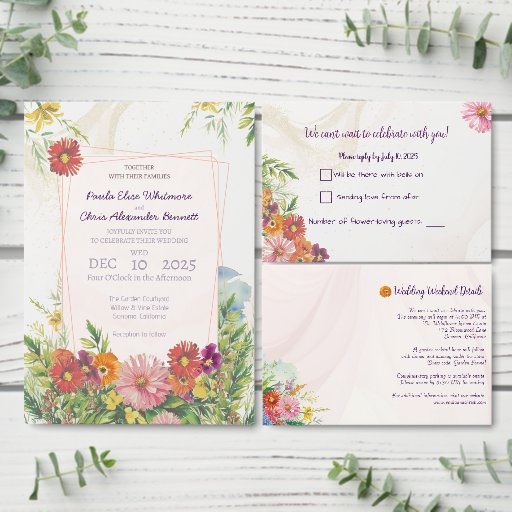Celebre seu amor no florescimento de cheios com este casamento maravilhosamente projetado, exceto a data com uma enxurrada borda de flor silvestre e pastéis macios e sonhosos. Ideal para um casamento de jardim ou celebração ao ar livre, esta elegante design emparelha flores românticas com uma tipografia refinada. O texto apresenta os nomes Paula Elise Whitmore e Chris Alexander Bennett, mas pode ser totalmente personalizado com seus próprios detalhes — incluindo nomes, data de casamento, local e informações de RSVP. Quer você esteja planejando um caso rústico ao ar livre ou uma cerimônia de vinhedo, este convite dá o tom perfeito.