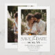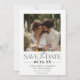 Um eterno e um elegante cartão de data salve o cartão com um layout preto e branco clássico com fontes de na moda serif e script manuscrito. A parte superior mostra sua foto favorita do noivado, enquanto o fundo branco limpo mantém o design sem esforço refinado. Ideal para casais planejando um casamento moderno, chic ou de destino. Use-o para cerimônias de outono ou verão com temas florais ou externos. Layout correspondente disponível para mais personalização.