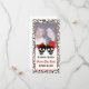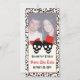 Casamento preto vermelho do Halloween Salve o cartão com fotos da Data, apresentando uma noiva de casal do crânio preto e noiva sobre fundo de marfim e uma borda padrão do crânio. O noivo veste um chapéu vermelho e a noiva um arco vermelho.