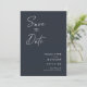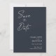 Cartões com fotos modernos, minimalistas e elegantes do noivado de casamento "Salvem a Data". Este design personalizado com elementos de texto moderno com um script de tinta de caligrafia exclusivo. A foto dos casais destaca a parte traseira da placa. As cores são brancas escrevendo em azul de ardósia ou personalizam facilmente a cor base conforme necessário.
