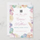 Este conjunto de papelaria para casamento apresenta ilustrações de conchas em aquarela em tons pastel suaves que variam do roxo ao amarelo, azul turquesa, azul aquamarine, laranja e rosa.