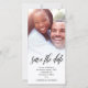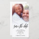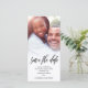 Salve o cartão com fotos personalizado com sua própria foto romântica. Salve a data escrita em um belo roteiro preto acima da data do casamento e informações adicionais para seus futuros convidados de casamento. A borda entre a foto do casamento e o texto é amolecida com um gradiente branco. Adicione seus nomes também!