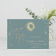 Sol e lua de ouro celestial, e estrelas num fundo verde de menta. Salve a data que pode ser personalizada com seu nome. Selecione o botão "personalizar" para alterar o estilo, a cor e o tamanho da fonte.