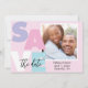 Tons pastel suaves se combinam para um cartão de "Salve a data" moderno e romântico de primavera. A frente do cartão apresenta a foto do casal cercada por uma moldura branca. O texto "a data" fica sobre "SALVE" em texto script preto. A parte de trás do cartão é um fundo roxo claro sólido e em branco.