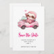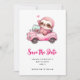 Salve a placa de data com uma ilustração química. Uma preguiça rosa dirigindo em um conversível rosa. Adorável.
