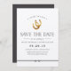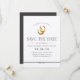 Rustic save the date design apresenta uma inscrição marrom-ameixa escura com "sortuda no amor" e um par de ferraduras de ouro-aquarela no topo.