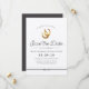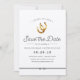 Rustic save the date design apresenta uma inscrição castanha escura de ameixa com acentos de script, com "sortuda no amor" e um par de ferraduras de ouro de aquarela no topo.