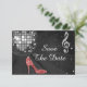 Placas achatadas de Cartões salve a data pretas de lado duplo impressas em papel de convite. Cartões de resposta personalizados e elegantes, com brilho e glamour. A bela sombra negra e branca da mulher, de dois lados, salve a data com uma bola de espelho retrovisor retro divertida, imagens impressas glamourosas, brilho, sequências, diamantes bling joels brilham saltos altos estilettos calçados de moda, e notas musicais brilhantes com brilho em um vibrante fundo preto e branco e brilha. Chic, clássico, fofo, giro, cartão moderno para festas de aniversário, Festa 16 Doce, Quinceanera, chás de panela, festa de solteira / noite de galinha, etc, em tendências, cores / cores da moda. Estas placas de groovy, rico, na moda, sofisticadas, bonito, girli são decoradas/impressas em ambos os lados. NOTA: todos os convites no Zazzle têm imagens impressas planas. Se precisar de assistência para personalizar seu produto, entre em contato comigo através da minha loja e eu ficarei feliz em ajudar.