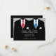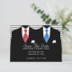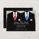 O Sr. e o Sr. Cinza, os temáticos Suit e Tie Gay Salvem os convites de Casamento de Datas / cerimônia civil - desenhados com um noivo vestindo uma gravata vermelha e o outro vestindo uma gravata azul - apresentados em um fundo riscado de cinza.. os convites de gay de designer são feitos com envelopes brancos.. design por Ricaso.