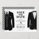 Deixe todos saberem que vocês dois fixaram uma data para o casamento com este cartão moderno de salve a data com dois ternos pretos. Personalize adicionando seus nomes, data e local do casamento.