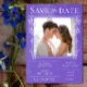 Anuncie seu dia de casamento com esta Foto estelar Salve o Anúncio de Data. Salve o design de data com um fundo estrelado e posicionamento de fotos para o casal feliz com embelezamentos de trilha estelar. Adicione sua foto e detalhes do casamento para personalizar.