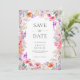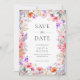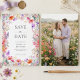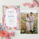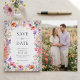 Announce your upcoming wedding with this summer wildflower save the date card. It features a pretty border of pink, coral and purple watercolor boho florals on a crisp white background. Personalize with your photo on the back. This design is perfect for couples planning a romantic spring or summer cottage garden ceremony with a botanical theme.